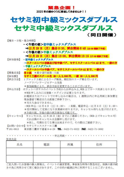 2025年12月29日(月)に年末ミックスダブルス大会を開催いたします!